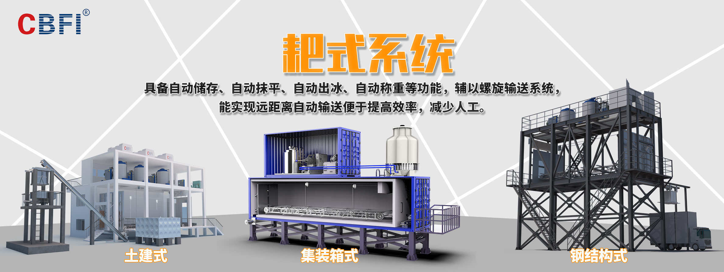 廣州冰泉制冷設(shè)備有限責(zé)任公司(商標(biāo)CBFI),大型氟制冷制冰設(shè)備行業(yè)開拓者,是一家立足國(guó)內(nèi)、面向全球,集大型食用制冰設(shè)備、大型工業(yè)制冰設(shè)備、高端商用制冰機(jī)、成套制冰系統(tǒng)的研發(fā)、設(shè)計(jì)、制造、銷售、售后服務(wù)于一體的創(chuàng)新創(chuàng)業(yè)型高新技術(shù)企業(yè),是大型冰廠和冷庫(kù)工程解決方案服務(wù)商。